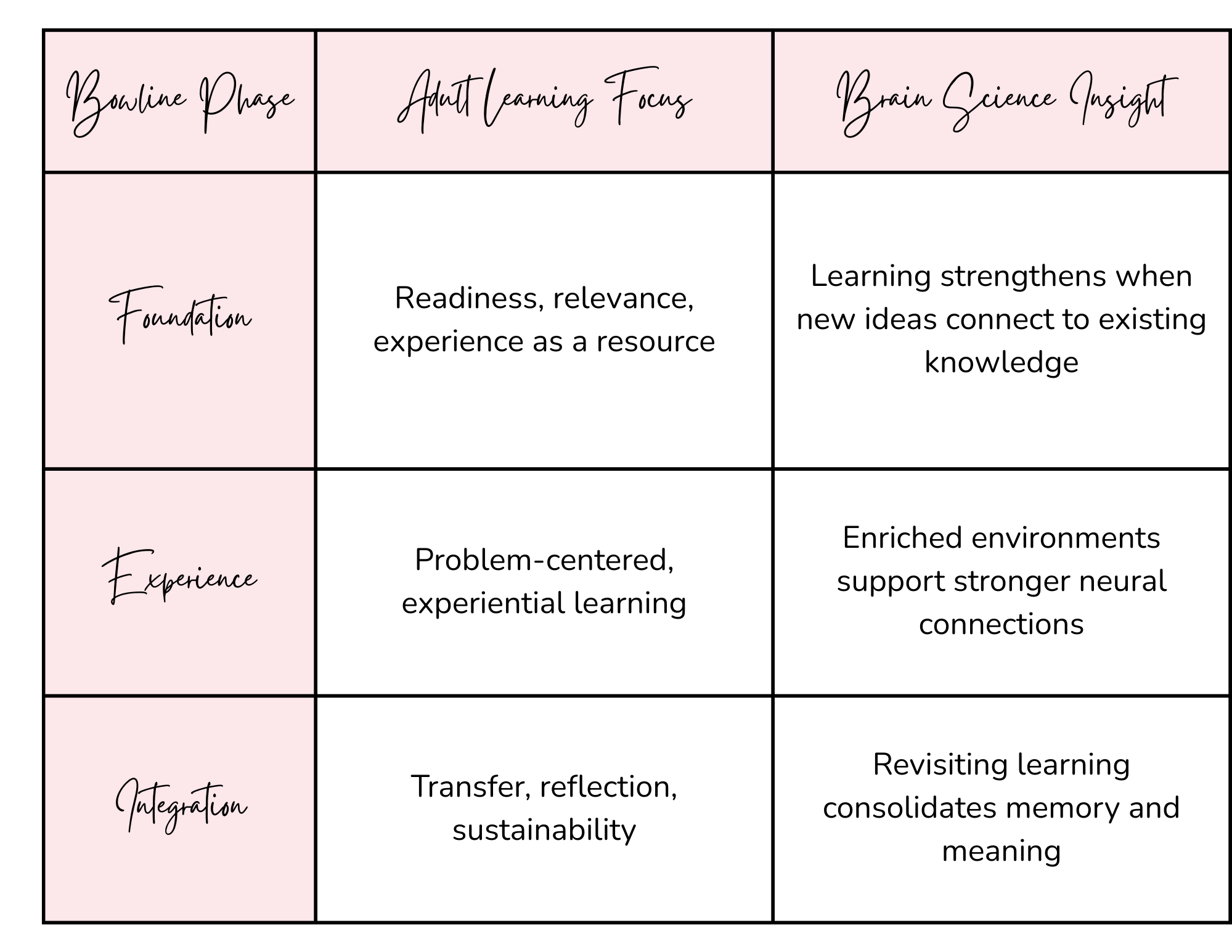 Bowline is intentionally aligned with established research on adult learning and how the adult brain forms and sustains learning. Each phase reflects core principles of andragogy and brain-based learning.